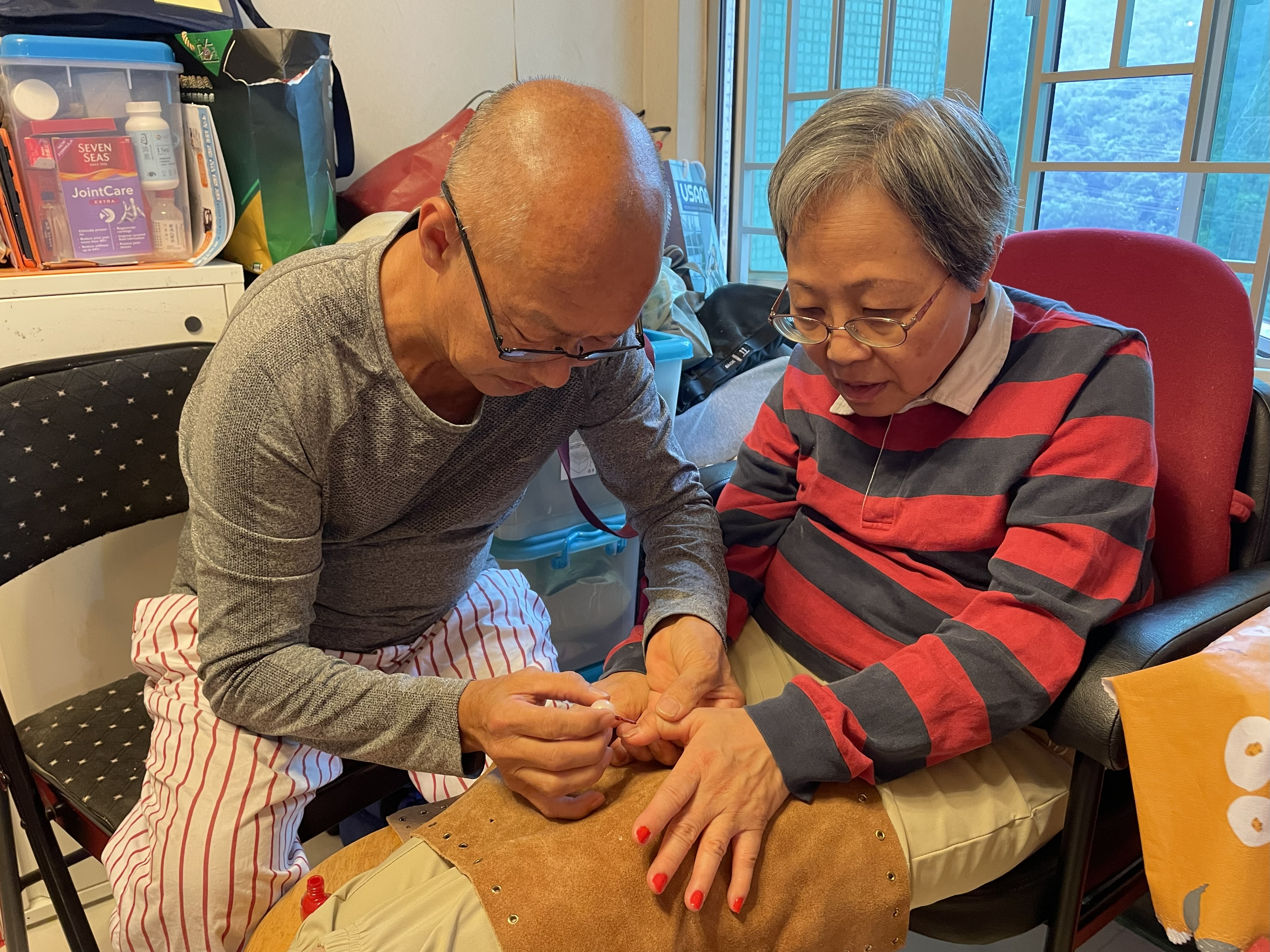 田裕中心會員張健誠先生(護老者)與太太黃美英女士以《甜甜蜜蜜》為攝影題目參加了是次比賽,並獲得「大專及公開組」優異奬。圖片中張先生細心地為太太油指甲油,展現與太太日常照顧的甜蜜瞬間,場面溫馨。